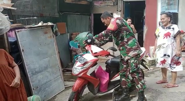Babinsa Kodim 1408/Mks Koptu Syaripuddin melaksanakan kegiatan Babinsa masuk dapur warga di RW 01 Lorong 15 Kelurahan Bunga Eja Beru, Kecamatan Tallo, Kota Makassar, Senin (31/10/2022). Koptu Syaripuddin memberikan sembako kepada orang tua tunggal Farida (48 tahun) yang bekerja sebagai penjual gorengan.