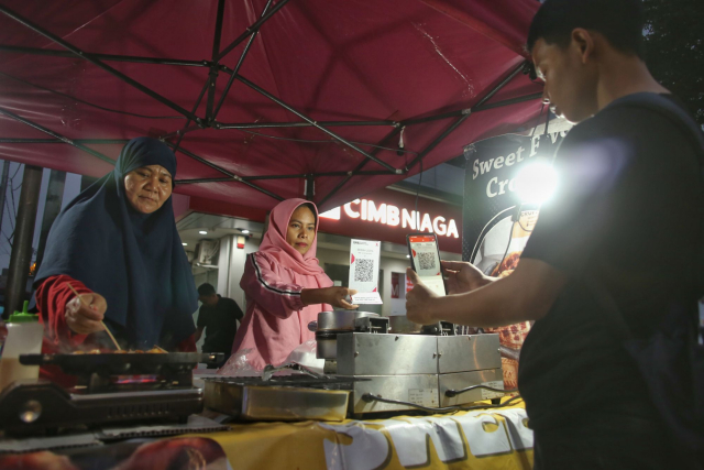 Pembeli melakukan transaksi pembayaran digital di pedagang kaki lima Jalan Boulevard, Makassar, Jumat (10/11/2023). PT Bank CIMB Niaga Tbk mencatat pertumbuhan total transaksi Quick Respons Indonesia Standard (QRIS) naik 3 kali lipat pada kuartal I tahun 2023. Sementara itu, CIMB Niaga terus melakukan sejumlah upaya, guna menggenjot penyaluran kredit kepada pelaku UMKM di Tanah Air.