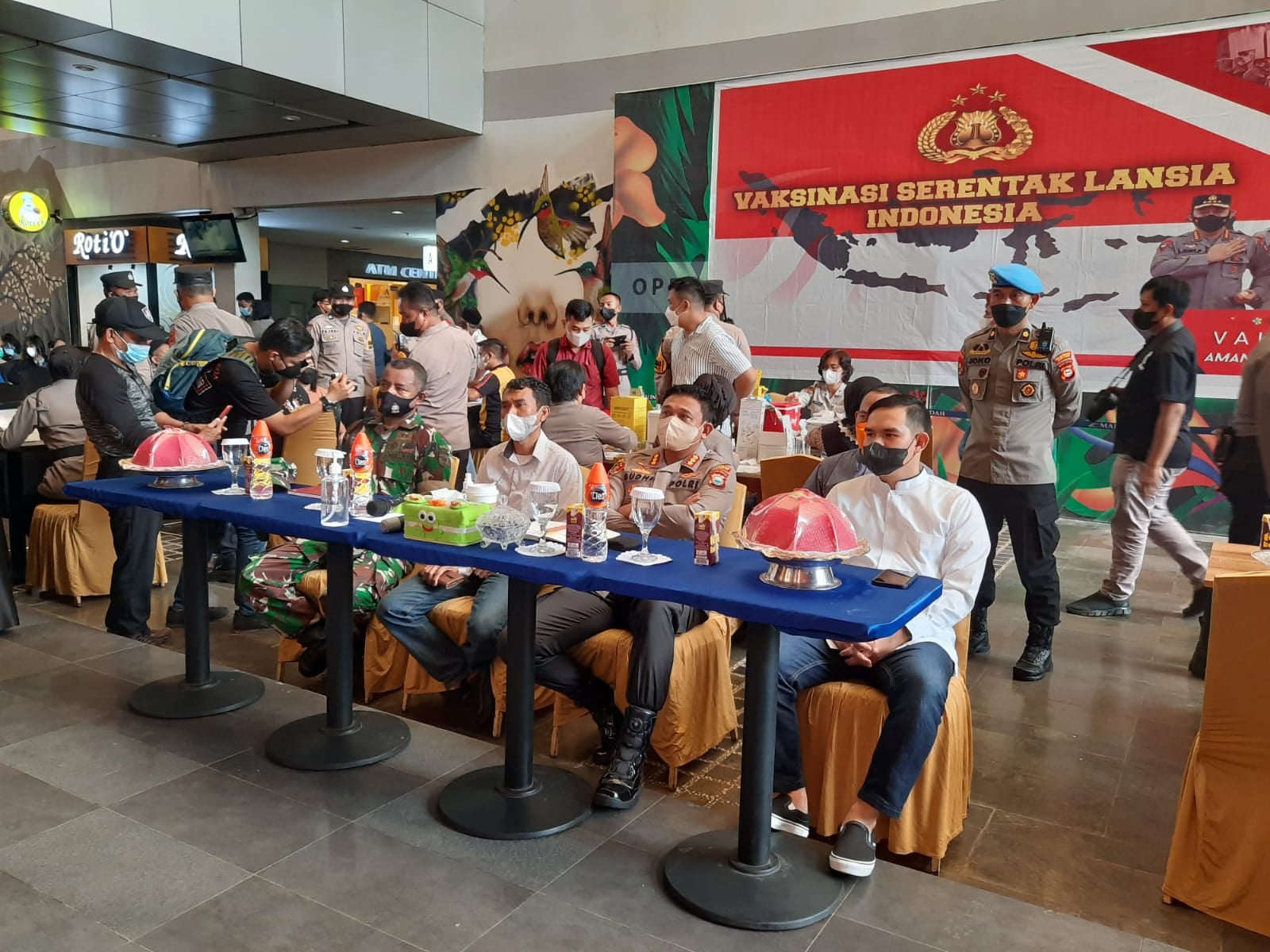 Plt Camat Mamajang M. Ari Fadli, S.STP Tinjau Kegiatan Vaksinasi Serentak Seluruh Indonesia yang dilaksanakan di Mall Ratu Indah, Jumat (11/02/2022). Gelaran Vaksinasi Massal yang dilaksanakan di Mall Ratu Indah ini merupakan dukungan dari Kepolisian Republik Indonesia (POLRI) serta bekerjasama dari beberapa pihak baik itu TNI, Dinas Kesehatan dan Sektor Lainnya. Di tengah gelombang Omicron yang saat ini dialami Indonesia, kombinasi disiplin menerapkan protokol kesehatan dan akselerasi vaksinasi sangat penting dilakukan, agar semeakin cepat seluruh mayarakat Indonesia terlindungi dari Covid-19. Hadir dalam kegiatan ini Kapolrestabes Makassar, Kapolsek Mamajang, Danramil, Babinkambtibmas serta para Lurah Se-Kecamatan Mamajang.