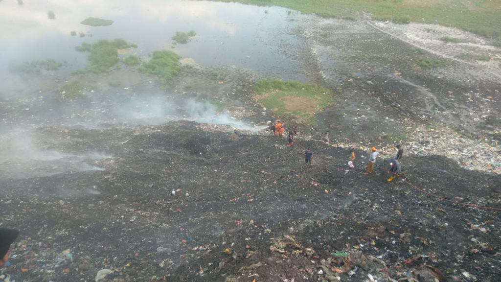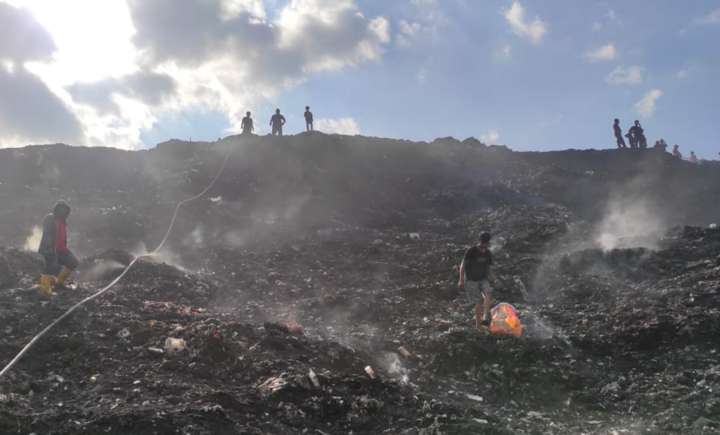 Petugas dari Dinas Pemadam Kebakaran (Damkar) Kota Makassar berusaha memadamkan api yang melanda Tempat Pembuangan Akhir (TPA) Antang, Makassar, Sulawesi Selatan, Selasa (27/9/2022). Saat ini petugas damkar sedang berada di lokasi untuk melakukan pemadaman.