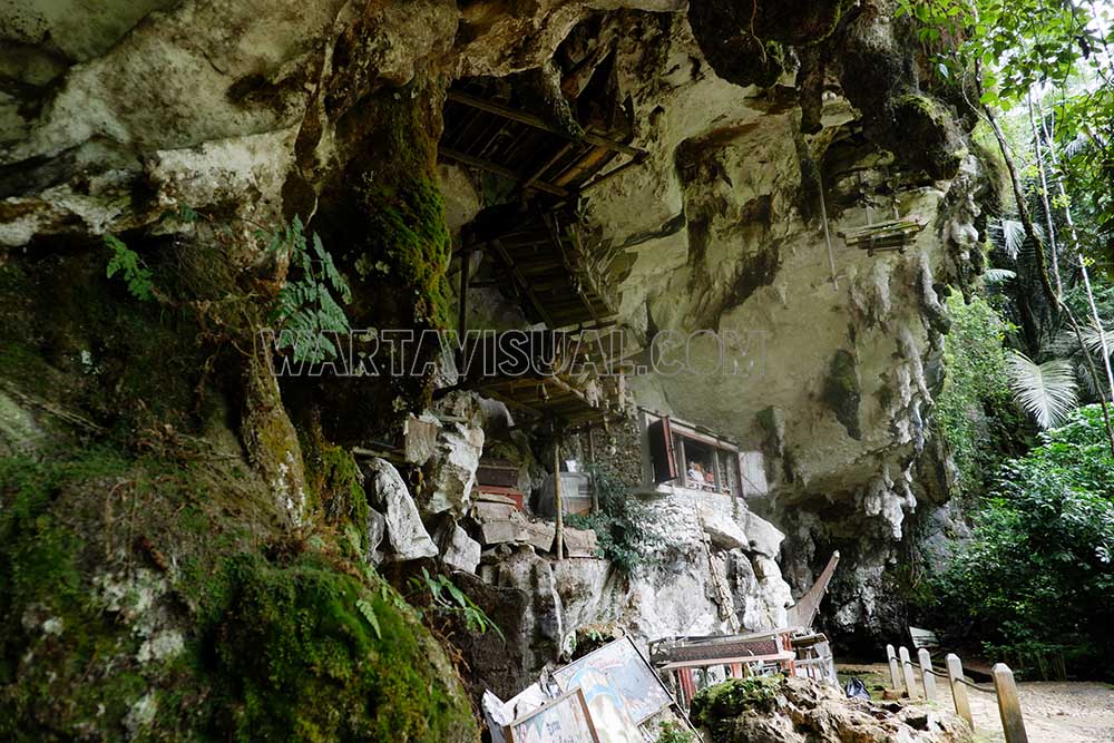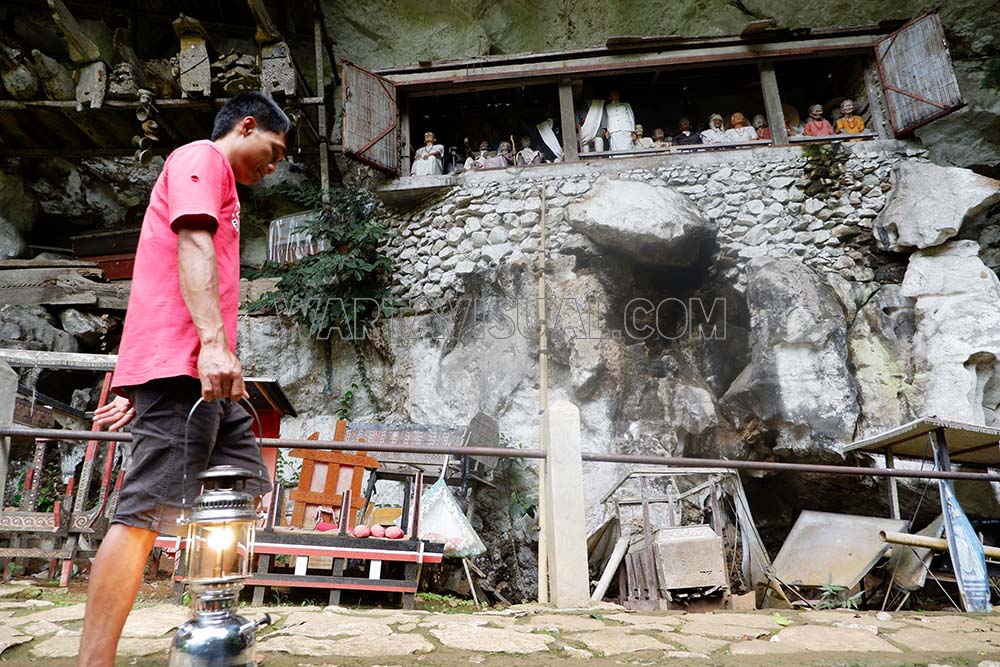 Sejumlah pengunjung di kawasan kuburan batu Kete Kesu, Kabupaten Toraja Utara, Sulawesi Selatan, Sabtu (25/12/2021). Kete Kesu terkenal dengan adat dan kehidupan tradisional masyarakatnya yang masih dilestarikan hingga saat ini. Di sana, wisatawan dapat melihat rumah adat, kuburan batu yang diperkirakan berusia 500 tahun, hingga gua yang di dalamnya penuh dengan kuburan. Desa ini termasuk kawasan cagar budaya dan menjadi pusat dari wartaVisusal/Andi Muhammad berbagai upacara adat Toraja, meliputi pemakaman adat rambu solo, upacara memasuki rumah baru atau rambu tuka, dan ritual adat lain yang umumnya dilakukan di tempat ini pada bulan Juli hingga Desember.