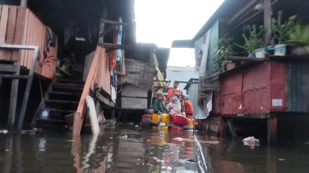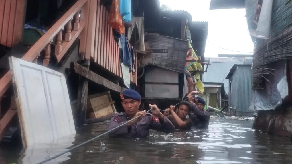 Aksi Sigap anggota Batalyon A Pelopor Satbrimob Polda Sulsel berjibaku mengevakuasi warga, barang- barang dan motor milik warga di lorong 5 Jalan Andi Tonro Kota Makassar, Senin (13/2/2023). Dengan berbekal perahu jerigen yang dirakit sedemikian rupa, Personel Batalyon A Pelopor berhasil mengevakuasi sedikitnya 40 kepala keluarga dari lokasi tersebut. Selain mengevakuasi warga terdampak banjir, para personel Brimob juga menyisir disetiap lorong serta menjemput warga yang terdampak banjir di lokasi dari rumah ke rumah.