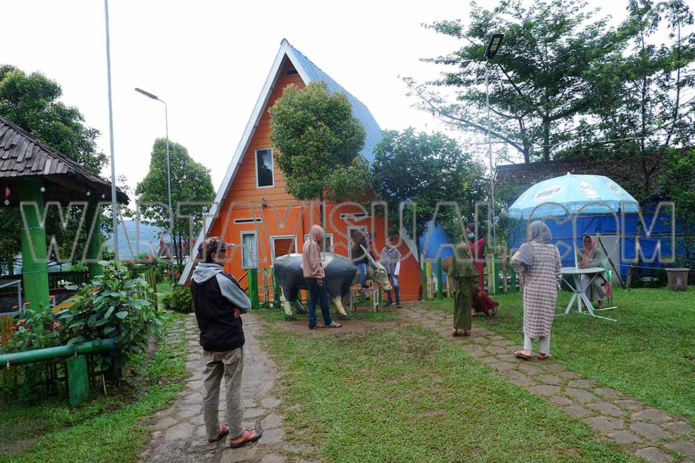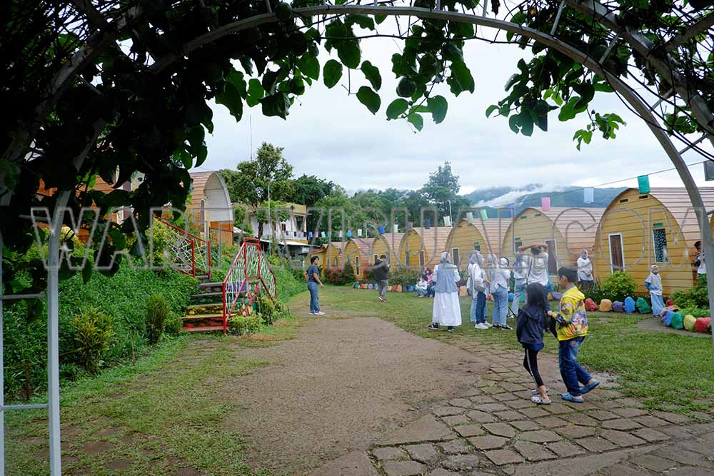 Sejumlah pengunjung di kawasan wisata Rumah Kurcaci D’Sawah, Malino, Kabupaten Gowa, Sulawesi Selatan, Minggu (02/01/2022). Rumah Kurcaci D’Sawah memiliki konsep dan tema penataan unik yang terinspirasi oleh film kurcaci. Objek wisata dan penginapan ini dibangun di lereng bukit dengan pemandangan pegunungan sejauh mata memandang. Yang paling unik dari objek wisata yang satu ini ialah lokasinya yang berdekatan dengan destinasi wisata lainnya. Jadi, jika Anda sedang mengunjungi Rumah Kurcaci D’Sawah jangan lupa untuk menginap dan lakukan eksplorasi wilayah Malino.